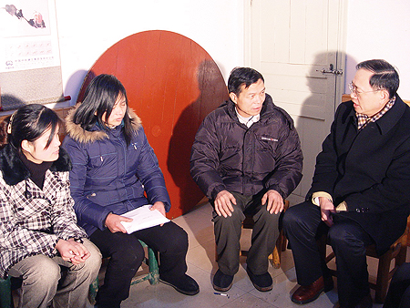 2008年2月5日,太保集團總經(jīng)理霍聯(lián)宏冒著嚴寒趕到熊大勇家中慰問英雄的父 母,代表全體太保干部員工向英雄父母致敬(從右至:霍聯(lián)宏、英雄父親、英雄母親、英雄姐姐)。