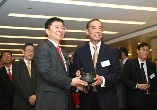高國富代表公司向香港聯(lián)交所主席夏佳理贈送上市紀(jì)念品——代表誠信的“中國用戶滿意鼎”(珍藏版)。