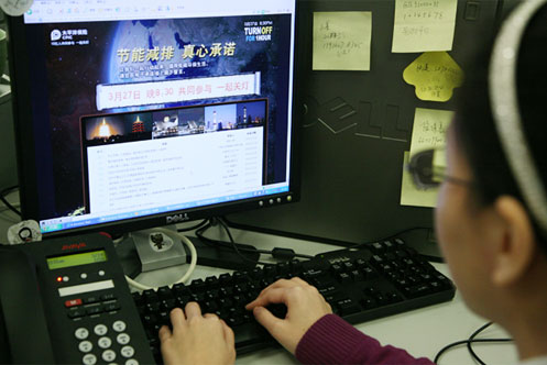 2010年3月26日一早,太平洋保險(xiǎn)的志愿者在總部大樓向員工發(fā)放“地球一小時(shí)”活動(dòng)宣傳資料。