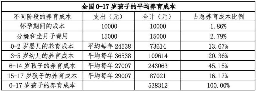 據(jù)《中國(guó)生育成本報(bào)告2024版》統(tǒng)計(jì),全國(guó)家庭0-17歲孩子的養(yǎng)育成本平均為53.8萬元,而0歲至大學(xué)本科畢業(yè)的養(yǎng)育成本平均為約68萬元。